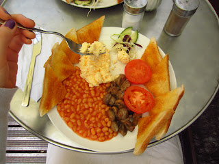 Turns out, tomatoes, beans, mushrooms and sunny side up eggs are not good together. Laura, like Troy, also forgot to specify "scrambled" eggs, and was disappointed (and grossed out) to discover that the English default to "sunny side up" when it comes to eggs.